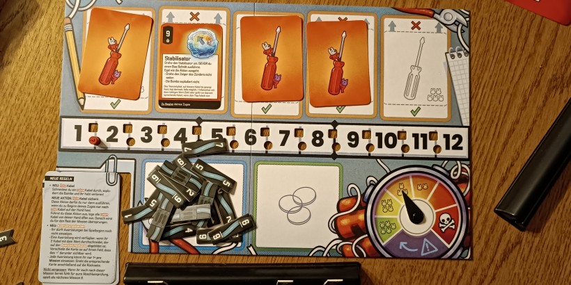 Fazit: Der Spielablauf ist schnell erlernt: zu Beginn gibt jeder Spieler eine Markierung für eines seiner Kabel ab (die Kabel haben allesamt Nummern von 1-12, es gibt noch gelbe Kabel und ein rotes). Von jeder Nummer gibt es vier Kabel (außer bei den gelben und roten), und nun ist es eure Aufgabe, Paare zu finden. Zunächst müsst ihr immer ein Kabel bei einem Mitspieler suchen, das zu einem eurer Kabel passt, es sei denn, sämtliche zu bildenden Paare sind bei euch. Dann könnt ihr auch beide Nummern bei euch benennen. Macht ihr hierbei einen Fehler, löst euer Mitspieler auf, welches Kabel bei ihm „angecheckt“ wurde, und der Bombentimer geht einen Schritt weiter. Macht ihr zu oft Fehler, explodiert die Bombe. Erwischt ihr das rote Kabel, knallt es ebenfalls. Das Spiel beinhaltet 66 Missionen mit steigendem Schwierigkeitsgrad, es gibt aber auch zusätzliche Optionen, je weiter ihr spielt. Zudem könnt ihr mit der Zeit auch Ausrüstungskarten einsetzen, die euch helfen, die Kabel zu entwirren.