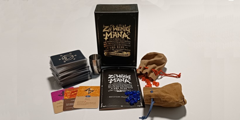 “Zu wenig Mana ist ein trankreiches Kartenspiel für 3-6 furchtlose Zauberer (das Mindestalter für den legalen Trankkonsum kann sich je nach Königreich unterscheiden).