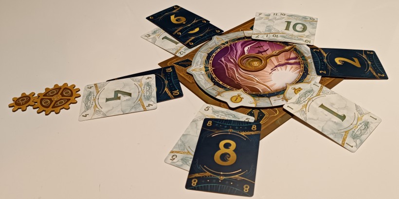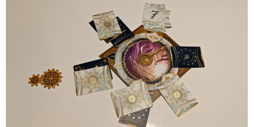 Das Spielprinzip ist denkbar einfach: Eine Uhr wird aufgedeckt, auf der sich insgesamt sechs Zonen befinden. Es gibt insgesamt 24 Spielkarten (jeweils die Karten 1-12, einmal als Tag-Variante, einmal als Nacht-Variante), und von diesen Karten werden lediglich 12 Karten ausgeteilt. Die einzelnen Zonen der Uhr müssen in der bald folgenden Legephase alle mit mindestens einer Karte belegt werden, und die Karten in den benachbarten Zonen müssen am Ende einen aufsteigenden Gesamtwert ergeben. Bis dahin simpel, oder? Nun werden die Karten aber verdeckt abgelegt, und in der Besprechungsphase wissen die Spieler gar nicht, welche Karten ausgeteilt wurden. Hinzu kommt, dass die Uhren individuelle Sonderanforderungen haben, zum Beispiel Restriktionen, dass nur weiße Karten, insgesamt 3 Karten, Karten mit einem Gesamtwert zwischen x und y gelegt werden dürfen, ein bestimmtes Feld zuerst besetzt werden muss, ein anderes an zweiter Stelle, etc. Je nach Spieleranzahl dürfen auch begrenzt viele Karten offen gelegt werden.